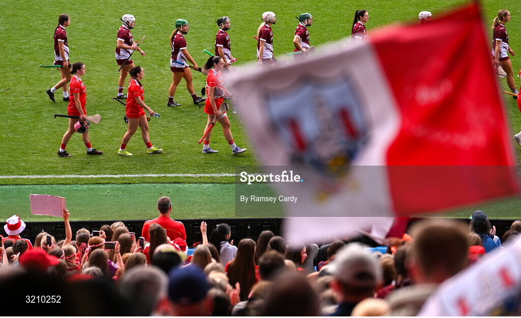 10 August 2025; The Cork and Galway teams parade behind The Artane Band before the Glen Dimplex All-Ireland Senior Camogie Championship final match between Cork and Galway at Croke Park in Dublin. Photo by Ramsey Cardy/Sportsfile