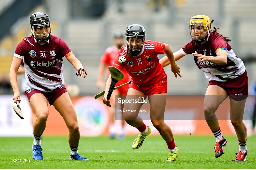 10 August 2025; Amy O’Connor of Cork in action against Siobhan Gardiner, left, and Annmarie Starr of Galway during the Glen Dimplex All-Ireland Senior Camogie Championship final match between Cork and Galway at Croke Park in Dublin. Photo by Ramsey Cardy/Sportsfile