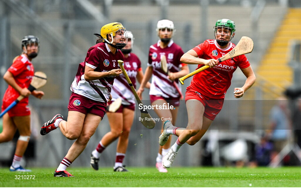 10 August 2025; Hannah Looney of Cork in action against Annmarie Starr of Galway during the Glen Dimplex All-Ireland Senior Camogie Championship final match between Cork and Galway at Croke Park in Dublin. Photo by Ramsey Cardy/Sportsfile