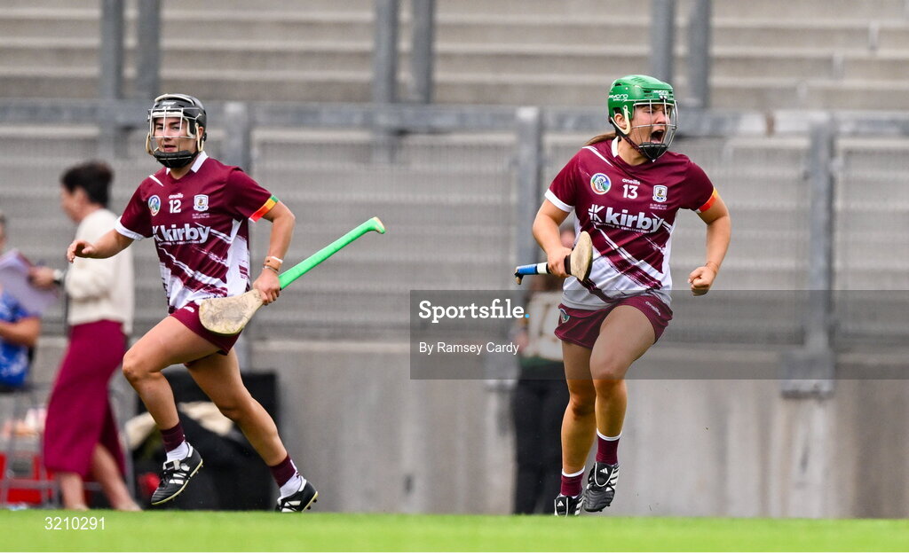 10 August 2025; Mairead Dillion of Galway, celebrates after scoring her side's first goal during the Glen Dimplex All-Ireland Senior Camogie Championship final match between Cork and Galway at Croke Park in Dublin. Photo by Ramsey Cardy/Sportsfile