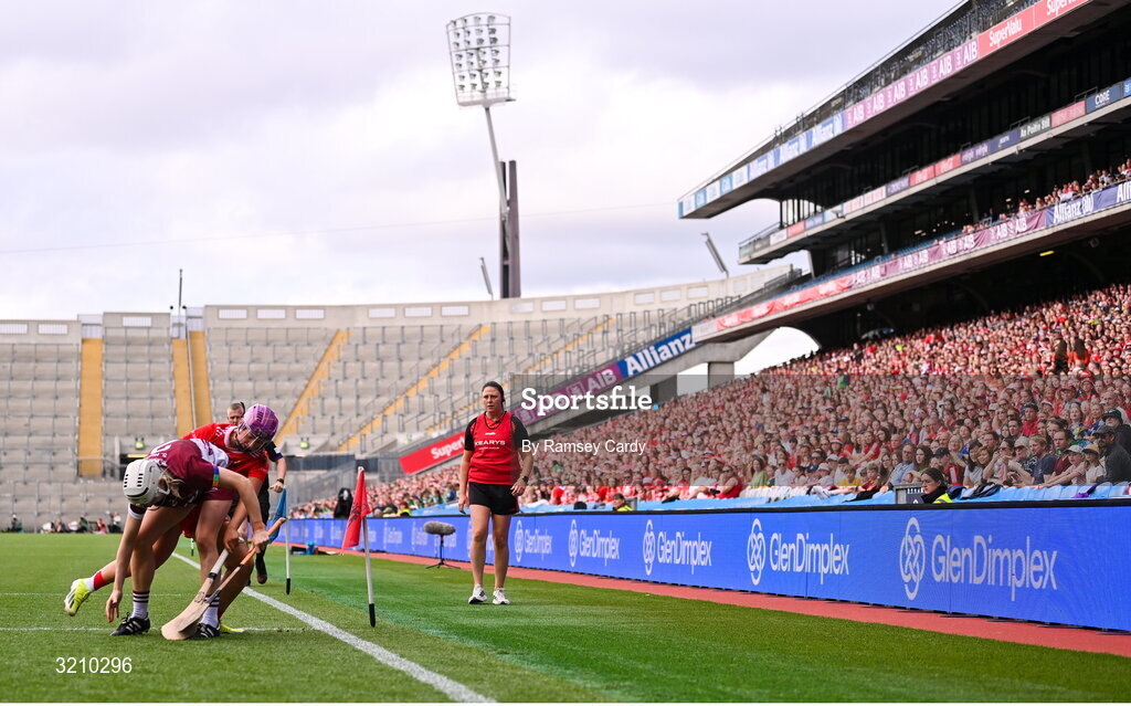 10 August 2025; Shauna Healy of Galway and Orlaith Cahalane of Cork during the Glen Dimplex All-Ireland Senior Camogie Championship final match between Cork and Galway at Croke Park in Dublin. Photo by Ramsey Cardy/Sportsfile