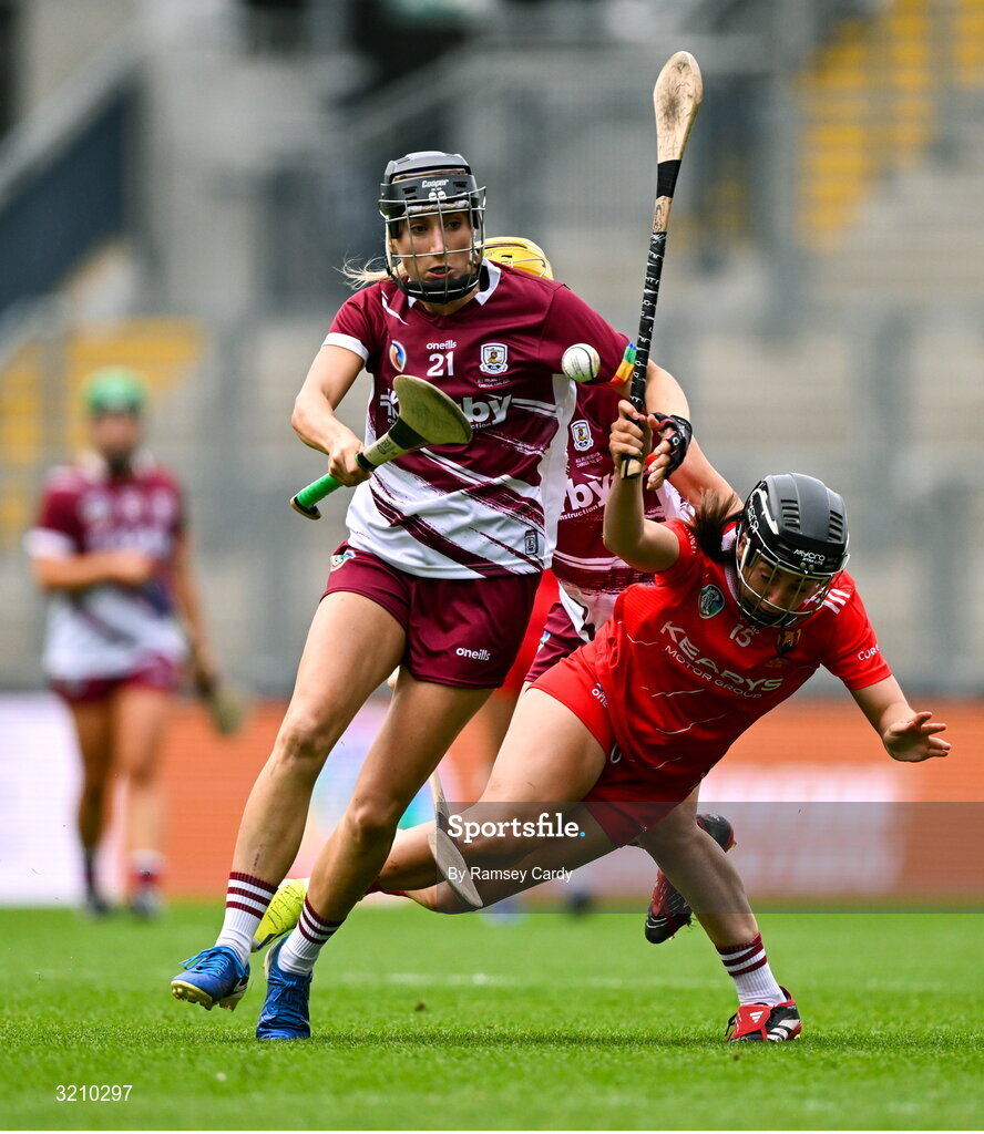 10 August 2025; Siobhan Gardiner of Galway and Amy O’Connor of Cork during the Glen Dimplex All-Ireland Senior Camogie Championship final match between Cork and Galway at Croke Park in Dublin. Photo by Ramsey Cardy/Sportsfile