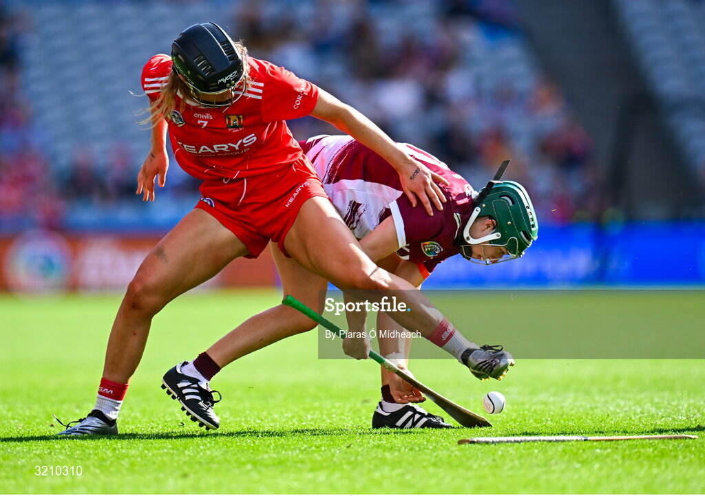 10 August 2025; Niamh Mallon of Galway in action against Laura Hayes of Cork during the Glen Dimplex All-Ireland Senior Camogie Championship final match between Cork and Galway at Croke Park in Dublin. Photo by Piaras Ó Mídheach/Sportsfile