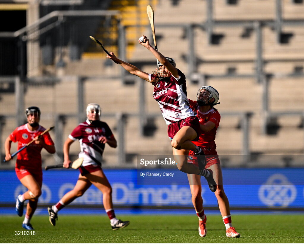 10 August 2025; Carrie Dolan of Galway and Meabh Cahalane of Cork during the Glen Dimplex All-Ireland Senior Camogie Championship final match between Cork and Galway at Croke Park in Dublin. Photo by Ramsey Cardy/Sportsfile