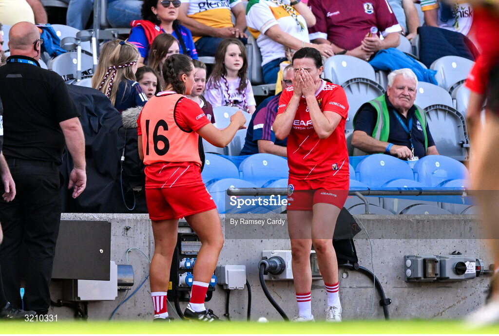 10 August 2025; Hannah Looney of Cork reacts after being shown a red card during the Glen Dimplex All-Ireland Senior Camogie Championship final match between Cork and Galway at Croke Park in Dublin. Photo by Ramsey Cardy/Sportsfile