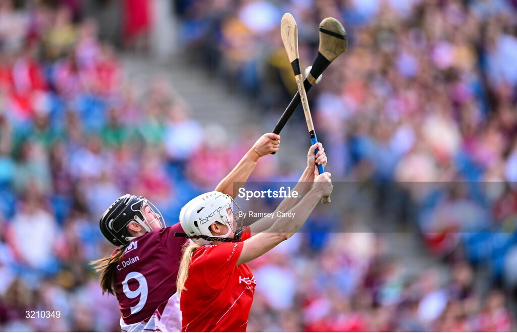 10 August 2025; Pamela Mackey of Cork and Carrie Dolan of Galway during the Glen Dimplex All-Ireland Senior Camogie Championship final match between Cork and Galway at Croke Park in Dublin. Photo by Ramsey Cardy/Sportsfile