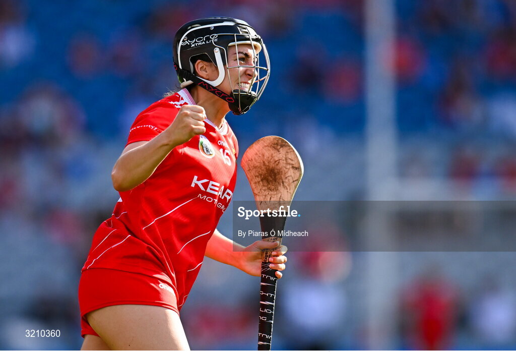 10 August 2025; Amy O’Connor of Cork celebrates after scoring a point during the Glen Dimplex All-Ireland Senior Camogie Championship final match between Cork and Galway at Croke Park in Dublin. Photo by Piaras Ó Mídheach/Sportsfile