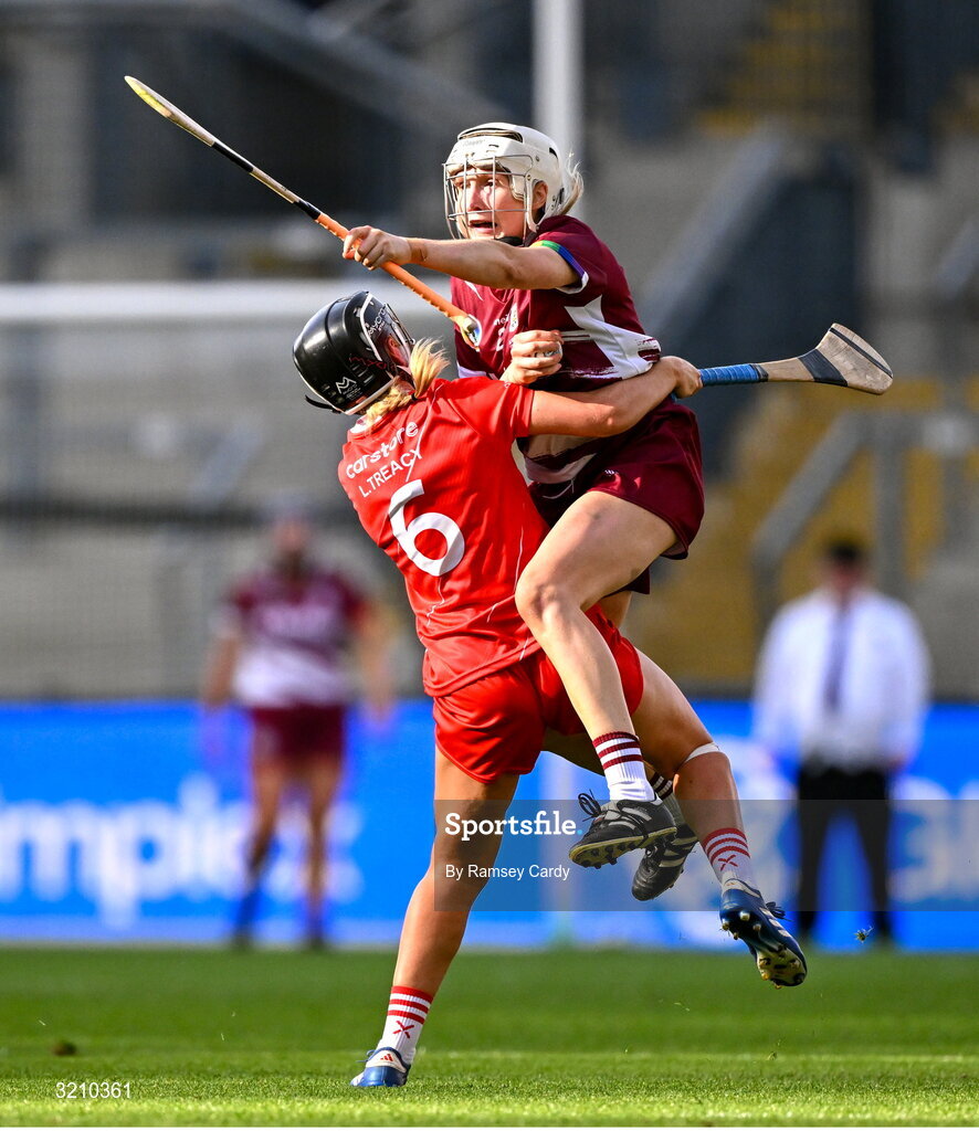 10 August 2025; Shauna Healy of Galway is tackled by Laura Treacy of Cork during the Glen Dimplex All-Ireland Senior Camogie Championship final match between Cork and Galway at Croke Park in Dublin. Photo by Ramsey Cardy/Sportsfile