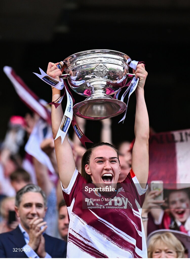 10 August 2025; Galway captain Carrie Dolan lifts the O'Duffy Cup after her side's victory in the Glen Dimplex All-Ireland Senior Camogie Championship final match between Cork and Galway at Croke Park in Dublin. Photo by Piaras Ó Mídheach/Sportsfile