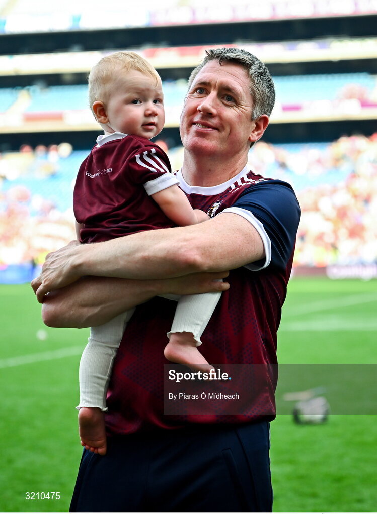 10 August 2025; Galway manager Cathal Murray with his son Aodhán after victory in the Glen Dimplex All-Ireland Senior Camogie Championship final match between Cork and Galway at Croke Park in Dublin. Photo by Piaras Ó Mídheach/Sportsfile
