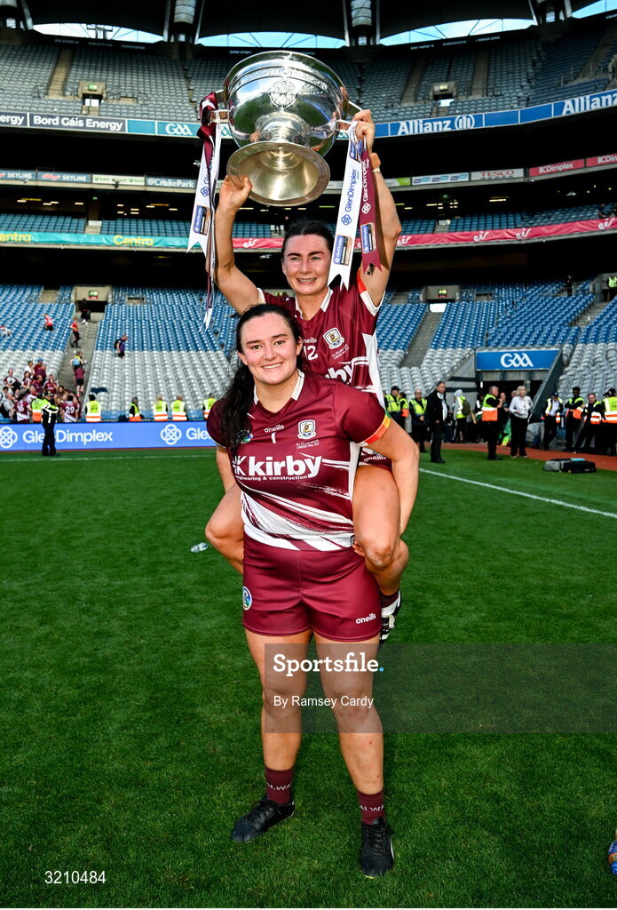 10 August 2025; Sarah Healy, carries Galway teammate Aoife Donohue, holding The O'Duffy Cup, after the Glen Dimplex All-Ireland Senior Camogie Championship final match between Cork and Galway at Croke Park in Dublin. Photo by Ramsey Cardy/Sportsfile