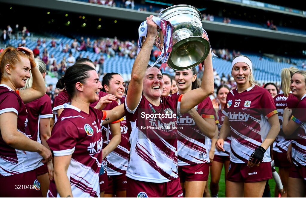 10 August 2025; Ailish O’Reilly of Galway celebrates with the O'Duffy Cup after victory in the Glen Dimplex All-Ireland Senior Camogie Championship final match between Cork and Galway at Croke Park in Dublin. Photo by Piaras Ó Mídheach/Sportsfile