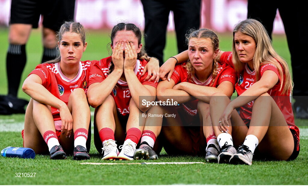 10 August 2025; Cork players, from left, Aoife O’Neill, Saoirse McCarthy, Laura Hayes and Ciara O’Sullivan dejected after the Glen Dimplex All-Ireland Senior Camogie Championship final match between Cork and Galway at Croke Park in Dublin. Photo by Ramsey Cardy/Sportsfile