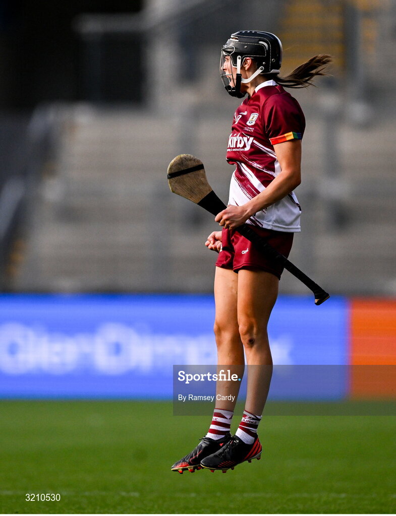 10 August 2025; Carrie Dolan of Galway celebrates scoring the match winning point from a free during the Glen Dimplex All-Ireland Senior Camogie Championship final match between Cork and Galway at Croke Park in Dublin. Photo by Ramsey Cardy/Sportsfile