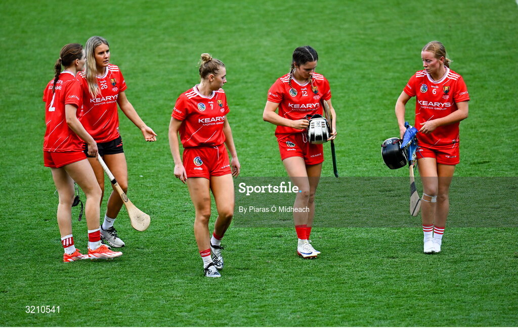 10 August 2025; Cork players, from left, Meabh Cahalane, Ciara O’Sullivan, Laura Hayes, Saoirse McCarthy and Laura Treacy of Cork leave the pitch after their side's defeat in the Glen Dimplex All-Ireland Senior Camogie Championship final match between Cork and Galway at Croke Park in Dublin. Photo by Piaras Ó Mídheach/Sportsfile