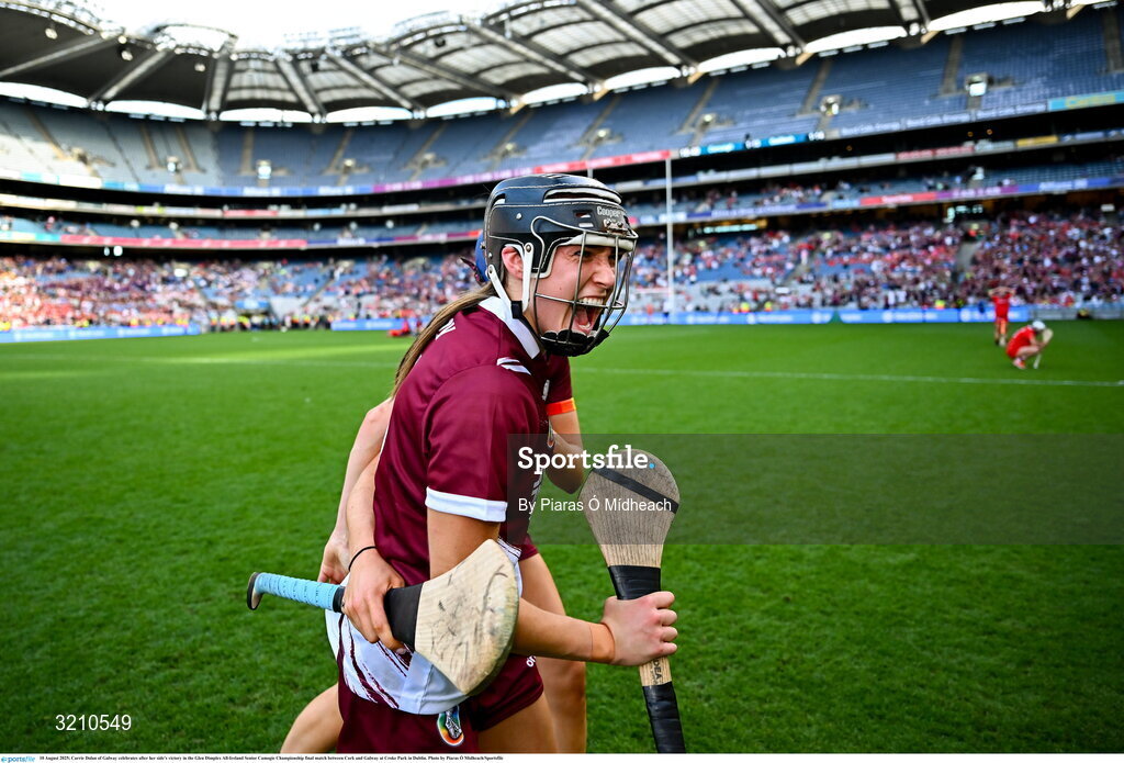 10 August 2025; Carrie Dolan of Galway celebrates after her side's victory in the Glen Dimplex All-Ireland Senior Camogie Championship final match between Cork and Galway at Croke Park in Dublin. Photo by Piaras Ó Mídheach/Sportsfile