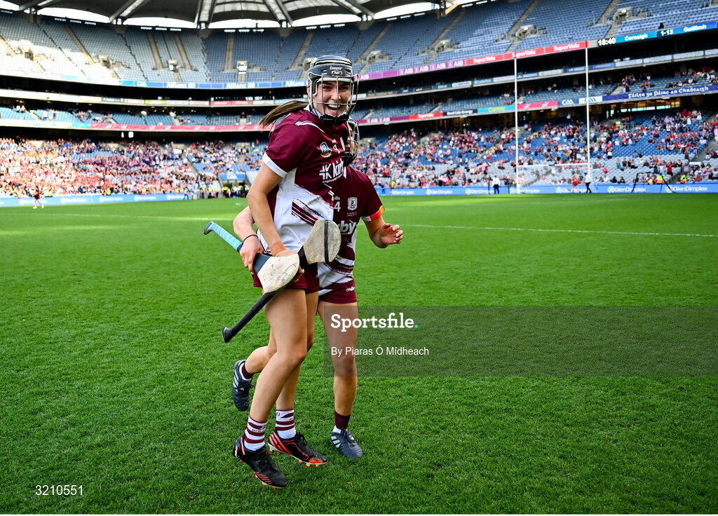 10 August 2025; Galway players Carrie Dolan, front, and Jennifer Hughes celebrate after their side's victory in the Glen Dimplex All-Ireland Senior Camogie Championship final match between Cork and Galway at Croke Park in Dublin. Photo by Piaras Ó Mídheach/Sportsfile