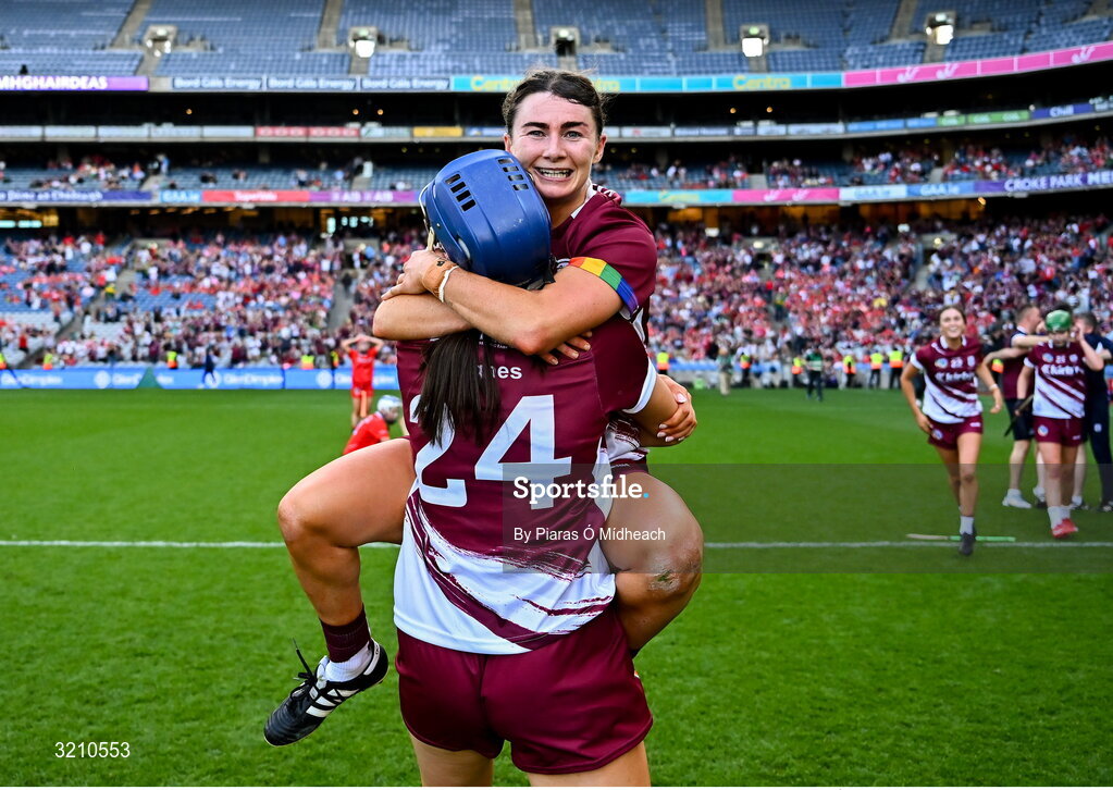 10 August 2025; Galway players Aoife Donohue, behind, and Jennifer Hughes celebrate after their side's victory in the Glen Dimplex All-Ireland Senior Camogie Championship final match between Cork and Galway at Croke Park in Dublin. Photo by Piaras Ó Mídheach/Sportsfile