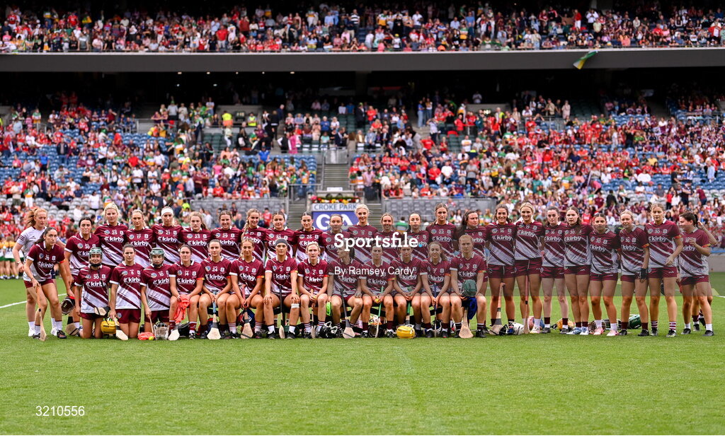 10 August 2025; The Galway team before the Glen Dimplex All-Ireland Senior Camogie Championship final match between Cork and Galway at Croke Park in Dublin. Photo by Ramsey Cardy/Sportsfile