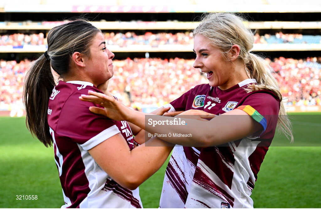10 August 2025; Galway players Niamh McInerney, left, and Olwen Rabbitte celebrate after their side's victory in the Glen Dimplex All-Ireland Senior Camogie Championship final match between Cork and Galway at Croke Park in Dublin. Photo by Piaras Ó Mídheach/Sportsfile