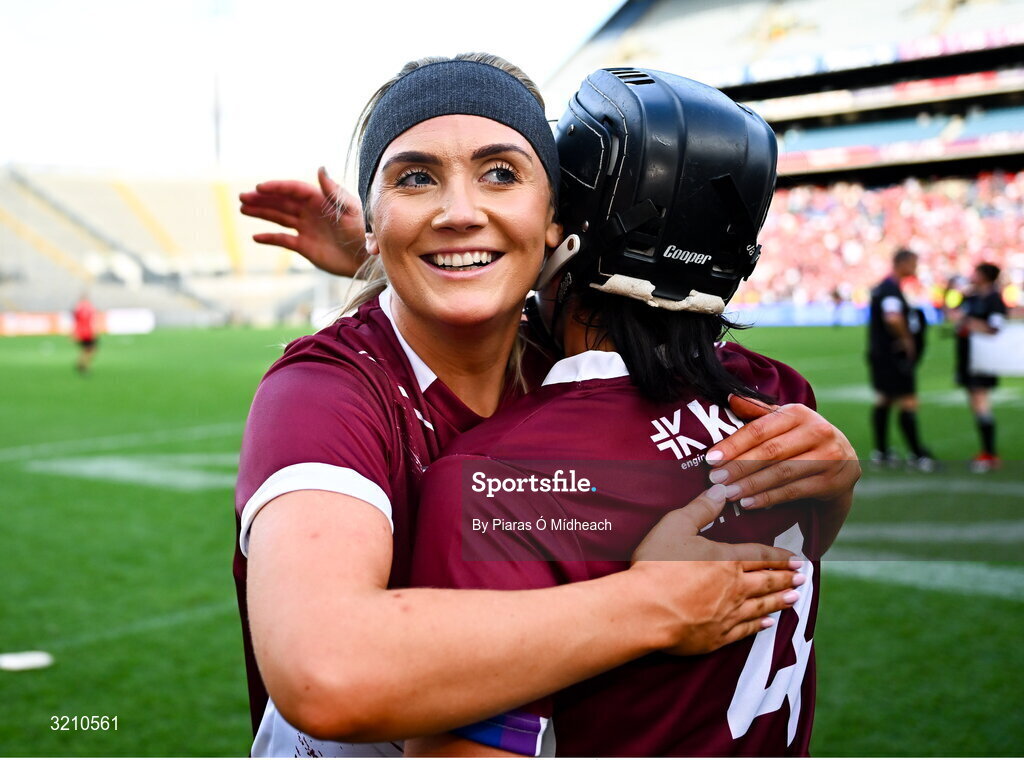 10 August 2025; Galway players Emma Helebert and Dervla Higgins, right, celebrate after their side's victory in the Glen Dimplex All-Ireland Senior Camogie Championship final match between Cork and Galway at Croke Park in Dublin. Photo by Piaras Ó Mídheach/Sportsfile