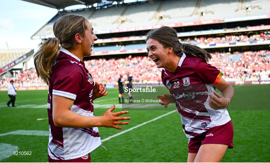 10 August 2025; Galway players Ciara Hickey, left, an Ally Hesnan celebrate after their side's victory in the Glen Dimplex All-Ireland Senior Camogie Championship final match between Cork and Galway at Croke Park in Dublin. Photo by Piaras Ó Mídheach/Sportsfile