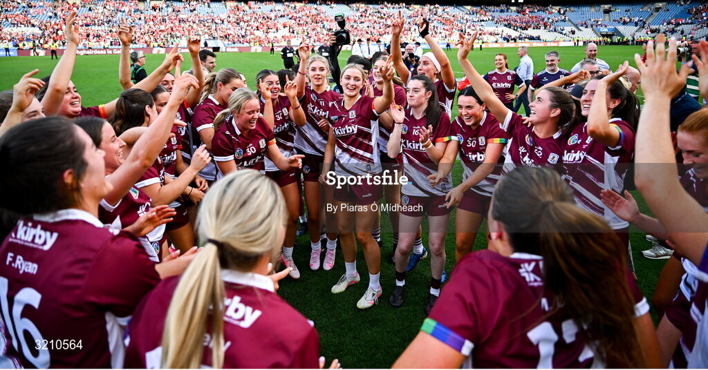 10 August 2025; Galway players celebrate after the Glen Dimplex All-Ireland Senior Camogie Championship final match between Cork and Galway at Croke Park in Dublin. Photo by Piaras Ó Mídheach/Sportsfile
