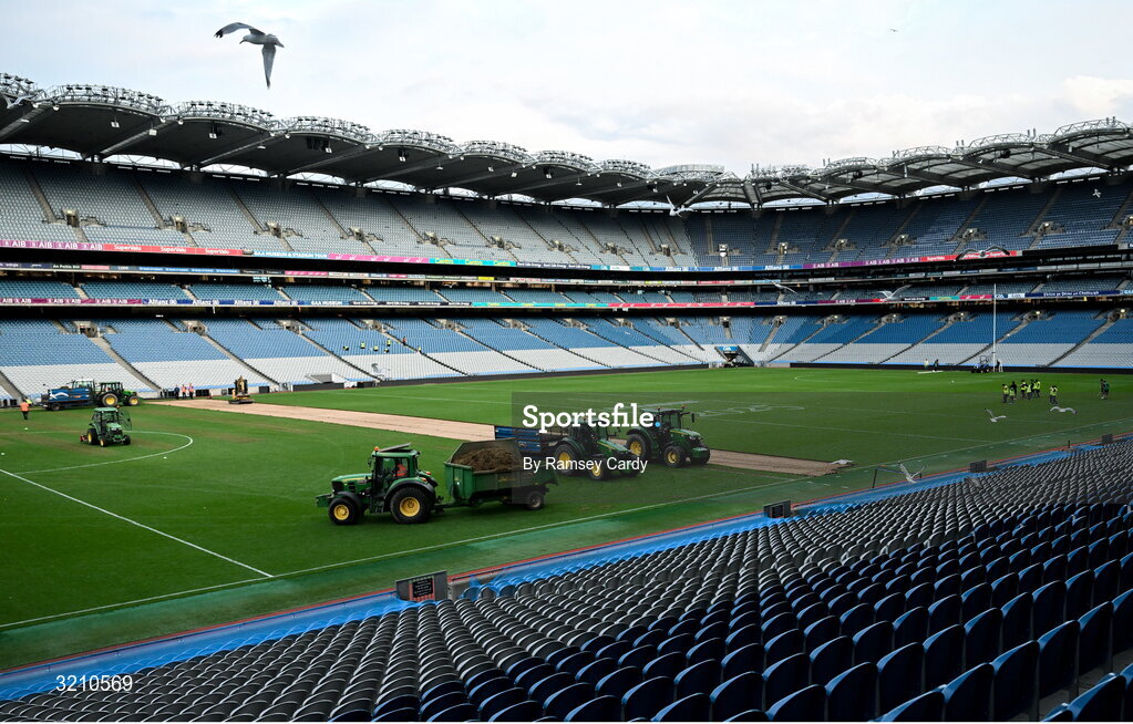 10 August 2025; Ground staff work on the pitch after the Glen Dimplex All-Ireland Senior Camogie Championship final match between Cork and Galway at Croke Park in Dublin, in advance of the upcoming concerts of Oasis and Robbie Williams in the stadium. Photo by Ramsey Cardy/Sportsfile