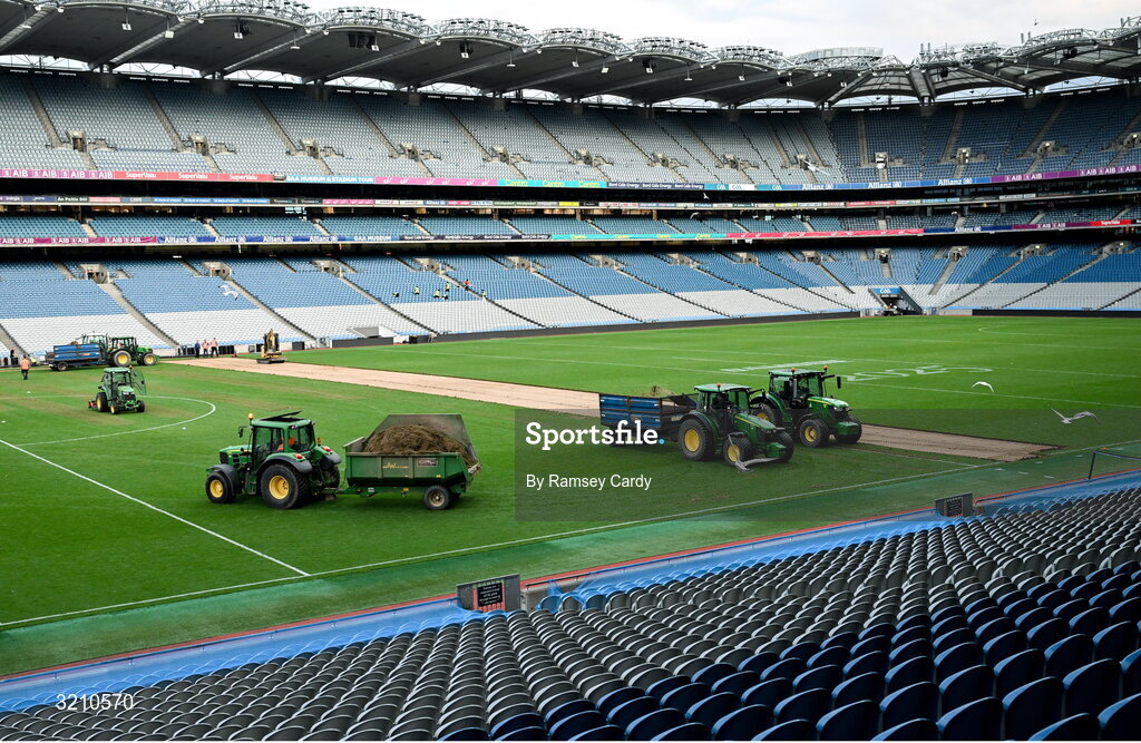 10 August 2025; Ground staff work on the pitch after the Glen Dimplex All-Ireland Senior Camogie Championship final match between Cork and Galway at Croke Park in Dublin, in advance of the upcoming concerts of Oasis and Robbie Williams in the stadium. Photo by Ramsey Cardy/Sportsfile