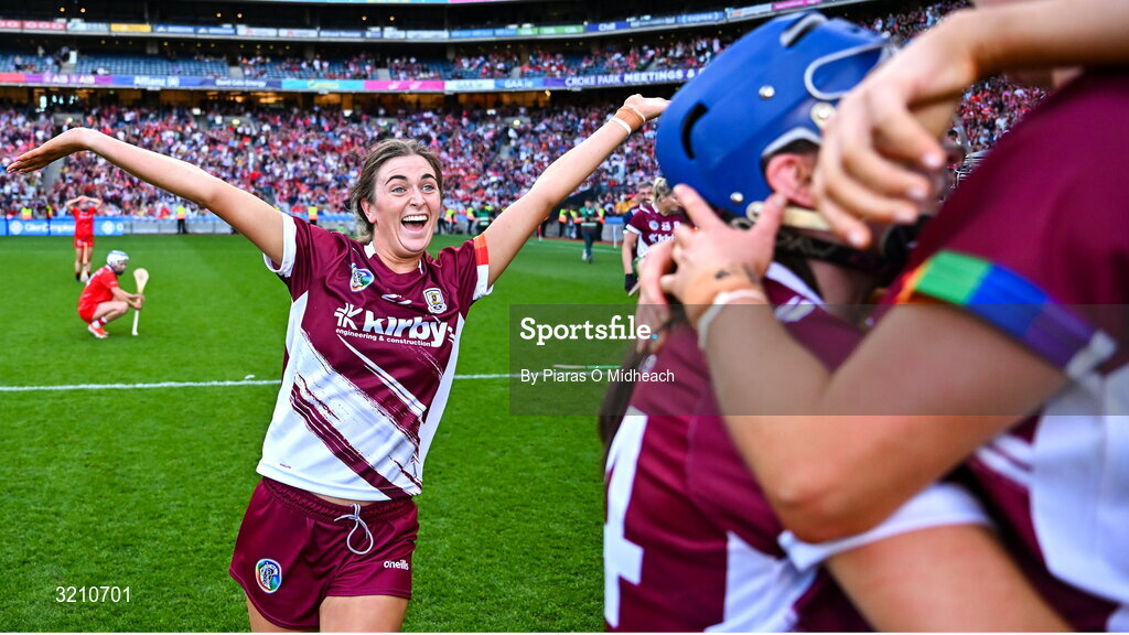 10 August 2025; Ally Hesnan of Galway celebrates after her side's victory in the Glen Dimplex All-Ireland Senior Camogie Championship final match between Cork and Galway at Croke Park in Dublin. Photo by Piaras Ó Mídheach/Sportsfile