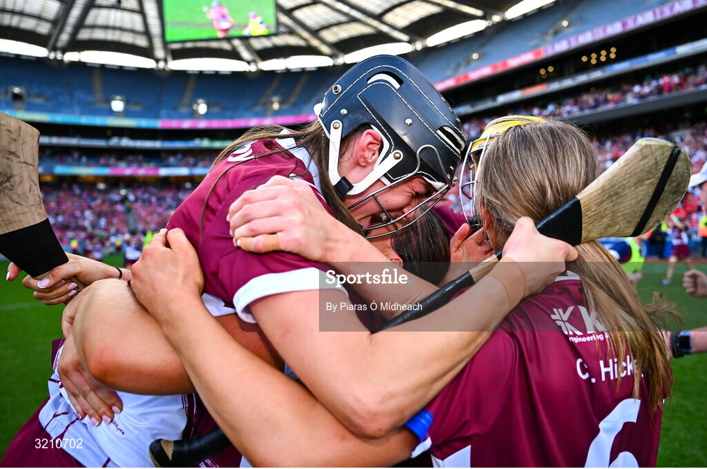 10 August 2025; Carrie Dolan of Galway, left, celebrates with team-mates after her side's victory in the Glen Dimplex All-Ireland Senior Camogie Championship final match between Cork and Galway at Croke Park in Dublin. Photo by Piaras Ó Mídheach/Sportsfile