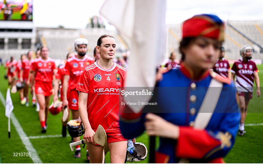 10 August 2025; Cork captain Meabh Cahalane leads her team-mates in the parade before the Glen Dimplex All-Ireland Senior Camogie Championship final match between Cork and Galway at Croke Park in Dublin. Photo by Piaras Ó Mídheach/Sportsfile