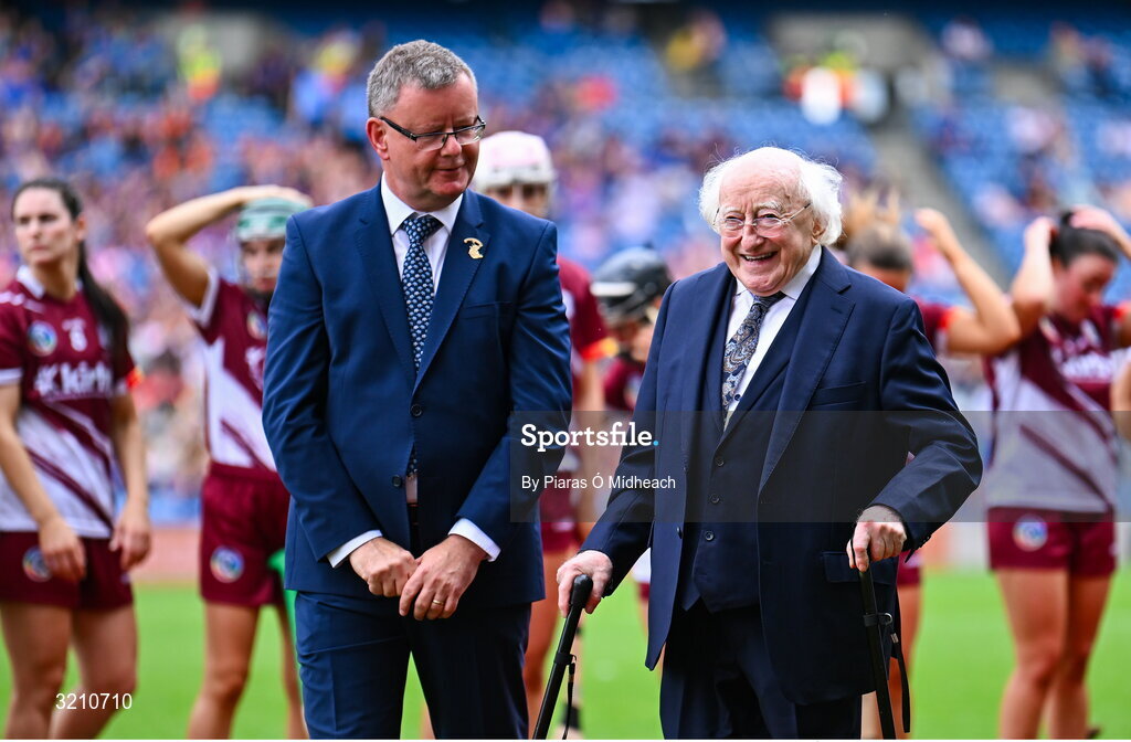 10 August 2025; President of Ireland Michael D Higgins waves to the crowd after meeting the teams and officials before the match on his last official visit to Croke Park while in office at the Glen Dimplex All-Ireland Senior Camogie Championship final match between Cork and Galway at Croke Park in Dublin. Photo by Piaras Ó Mídheach/Sportsfile