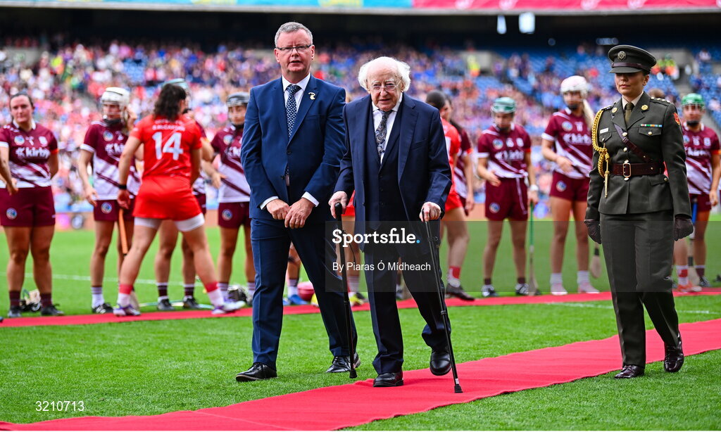 10 August 2025; President of Ireland Michael D Higgins waves to the crowd after meeting the teams and officials before the match on his last official visit to Croke Park while in office at the Glen Dimplex All-Ireland Senior Camogie Championship final match between Cork and Galway at Croke Park in Dublin. Photo by Piaras Ó Mídheach/Sportsfile