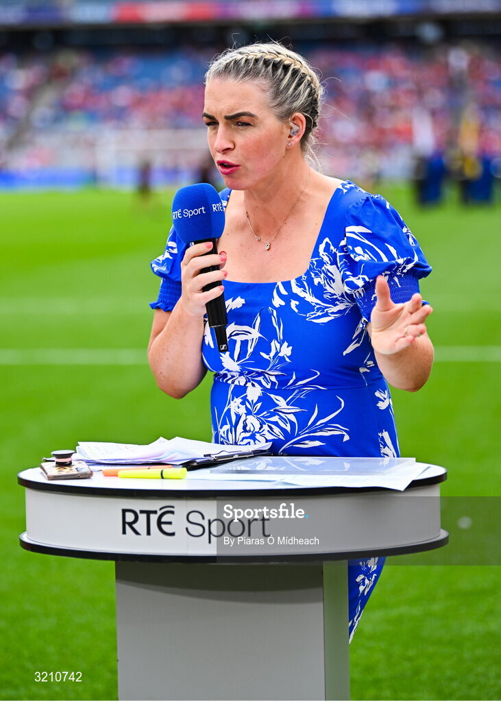 10 August 2025; RTÉ analyst Ursula Jacob at the Glen Dimplex All-Ireland Senior Camogie Championship final match between Cork and Galway at Croke Park in Dublin. Photo by Piaras Ó Mídheach/Sportsfile
