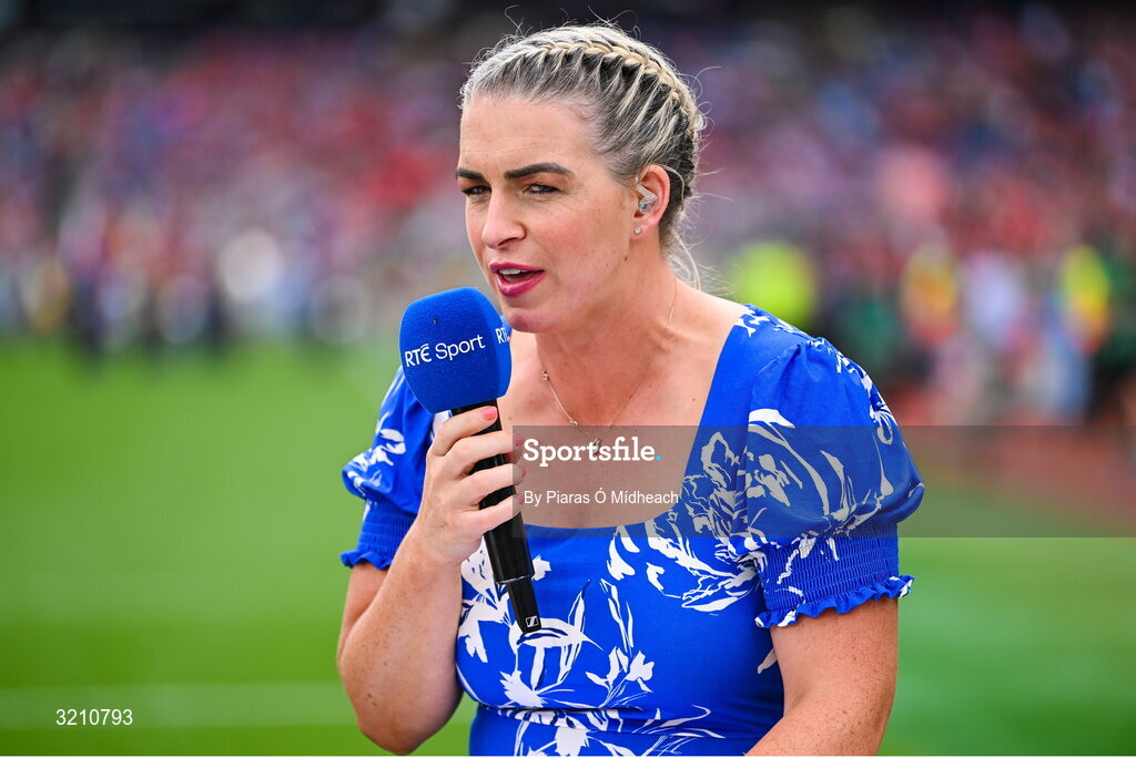 10 August 2025; RTÉ analyst Ursula Jacob at the Glen Dimplex All-Ireland Senior Camogie Championship final match between Cork and Galway at Croke Park in Dublin. Photo by Piaras Ó Mídheach/Sportsfile