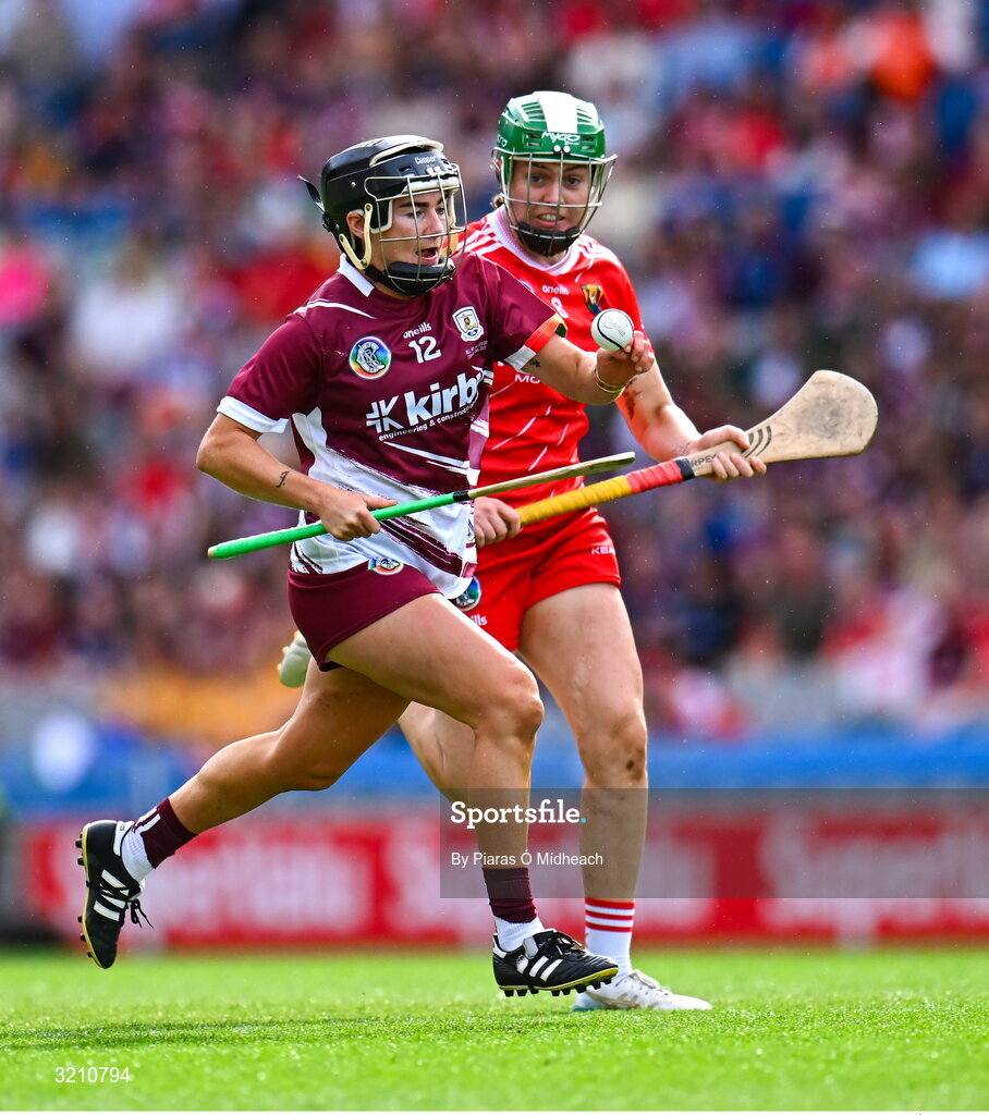 10 August 2025; Aoife Donohue of Galway in action against Hannah Looney of Cork during the Glen Dimplex All-Ireland Senior Camogie Championship final match between Cork and Galway at Croke Park in Dublin. Photo by Piaras Ó Mídheach/Sportsfile