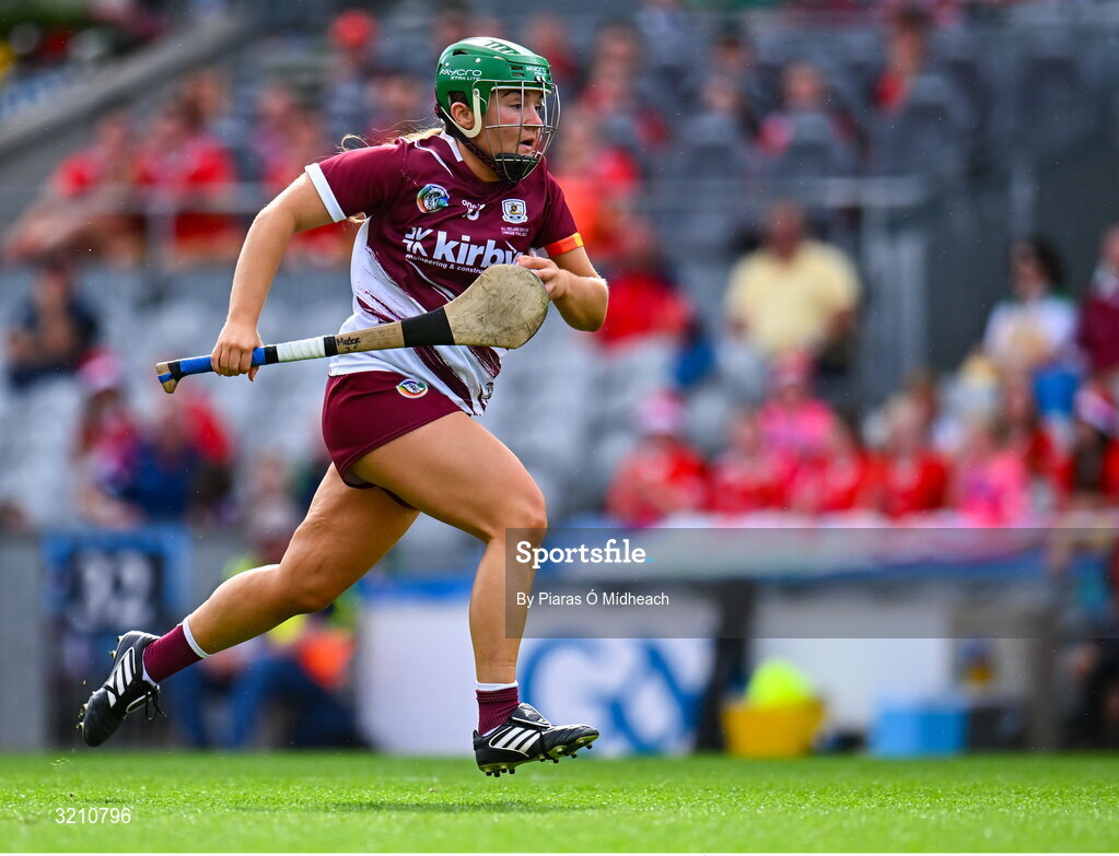 10 August 2025; Mairead Dillion of Galway on her way to scoring her side's first goal during the Glen Dimplex All-Ireland Senior Camogie Championship final match between Cork and Galway at Croke Park in Dublin. Photo by Piaras Ó Mídheach/Sportsfile