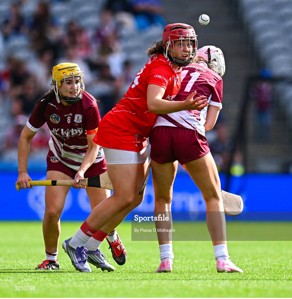 10 August 2025; Sorcha McCartan of Cork in action against Annmarie Starr, left, and Olwen Rabbitte of Galway during the Glen Dimplex All-Ireland Senior Camogie Championship final match between Cork and Galway at Croke Park in Dublin. Photo by Piaras Ó Mídheach/Sportsfile