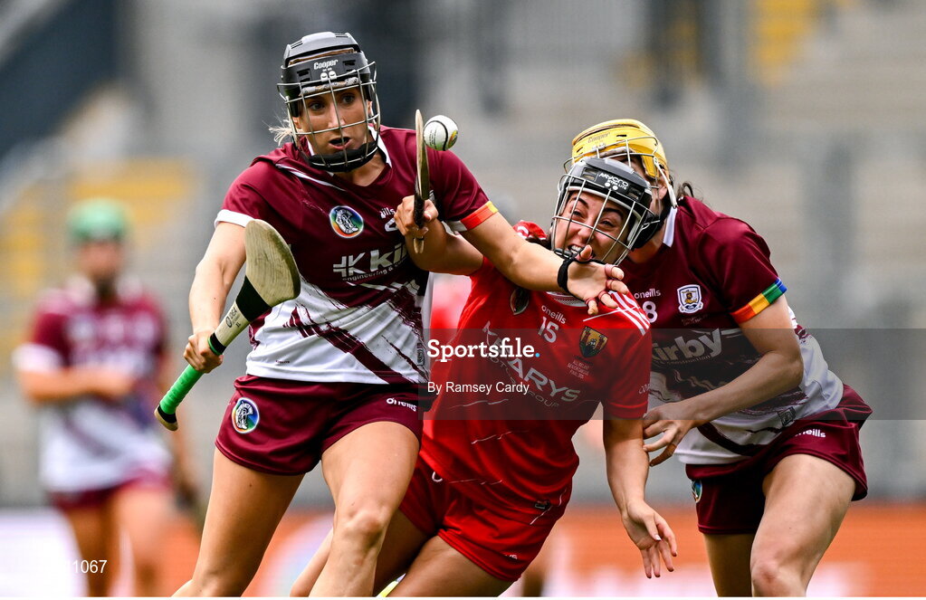 10 August 2025; Siobhan Gardiner of Galway and Amy O’Connor of Cork during the Glen Dimplex All-Ireland Senior Camogie Championship final match between Cork and Galway at Croke Park in Dublin. Photo by Ramsey Cardy/Sportsfile