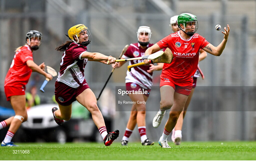 10 August 2025; Hannah Looney of Cork in action against Annmarie Starr of Galway during the Glen Dimplex All-Ireland Senior Camogie Championship final match between Cork and Galway at Croke Park in Dublin. Photo by Ramsey Cardy/Sportsfile