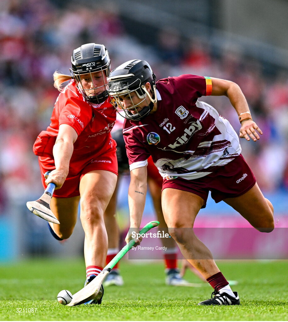 10 August 2025; Aoife Donohue of Galway and Laura Treacy of Cork during the Glen Dimplex All-Ireland Senior Camogie Championship final match between Cork and Galway at Croke Park in Dublin. Photo by Ramsey Cardy/Sportsfile