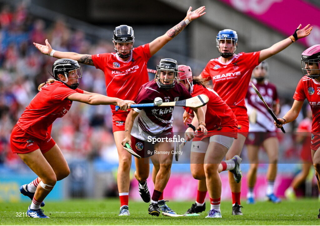 10 August 2025; Aoife Donohue of Galway in action against Cork players, from left, Laura Treacy, Ashling Thompson, Aoife Healy and Sorcha McCartan during the Glen Dimplex All-Ireland Senior Camogie Championship final match between Cork and Galway at Croke Park in Dublin. Photo by Ramsey Cardy/Sportsfile