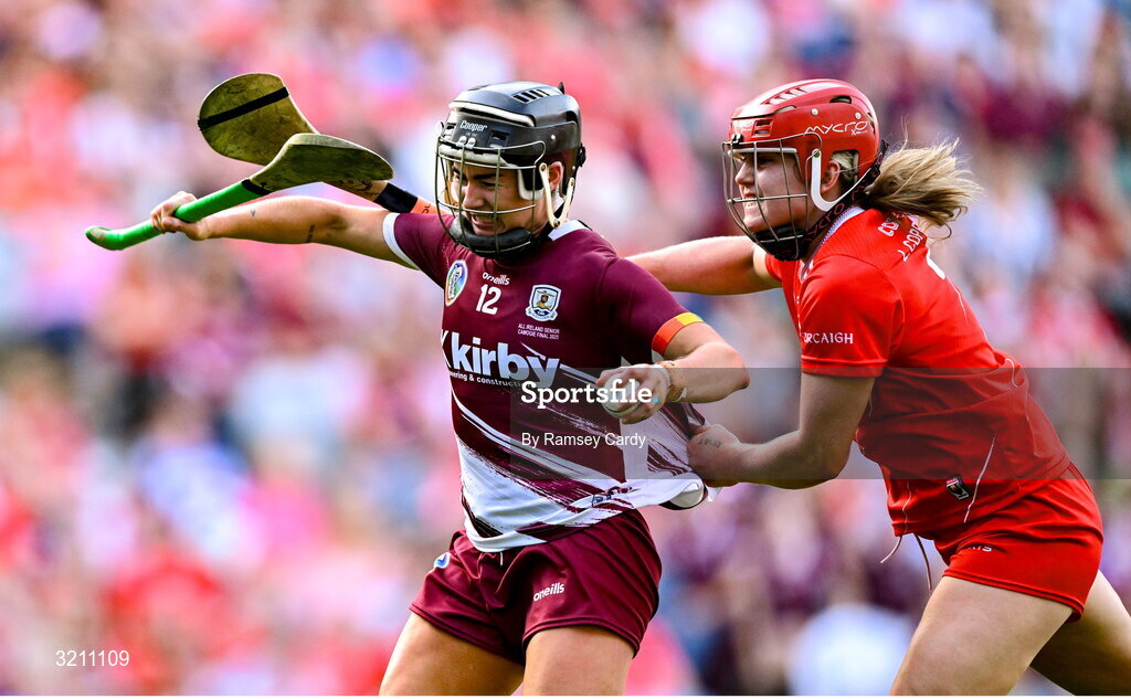 10 August 2025; Aoife Donohue of Galway in action against Libby Coppinger of Cork during the Glen Dimplex All-Ireland Senior Camogie Championship final match between Cork and Galway at Croke Park in Dublin. Photo by Ramsey Cardy/Sportsfile