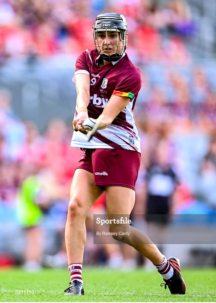 10 August 2025; Carrie Dolan of Galway takes a free during the Glen Dimplex All-Ireland Senior Camogie Championship final match between Cork and Galway at Croke Park in Dublin. Photo by Ramsey Cardy/Sportsfile