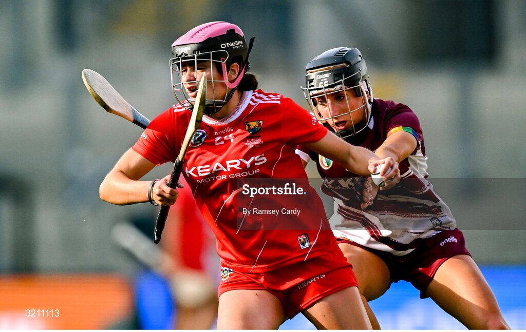 10 August 2025; Emma Murphy of Cork in action against Siobhan Gardiner of Galway during the Glen Dimplex All-Ireland Senior Camogie Championship final match between Cork and Galway at Croke Park in Dublin. Photo by Ramsey Cardy/Sportsfile