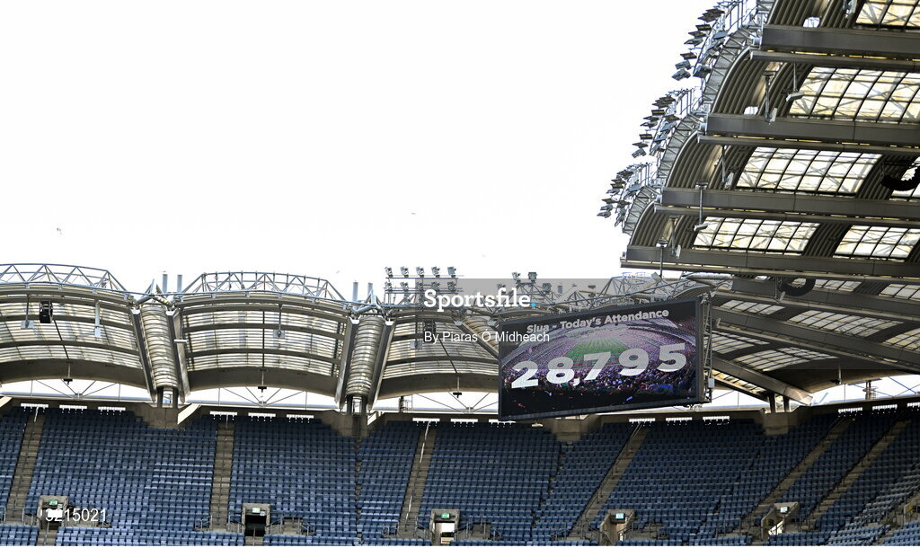 10 August 2025; The attendance of 28,795 is shown on a big screen at half-time during the Glen Dimplex All-Ireland Senior Camogie Championship final match between Cork and Galway at Croke Park in Dublin. Photo by Piaras Ó Mídheach/Sportsfile