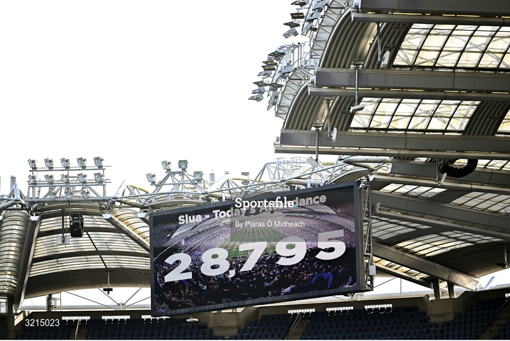 10 August 2025; The attendance of 28,795 is shown on a big screen at half-time during the Glen Dimplex All-Ireland Senior Camogie Championship final match between Cork and Galway at Croke Park in Dublin. Photo by Piaras Ó Mídheach/Sportsfile