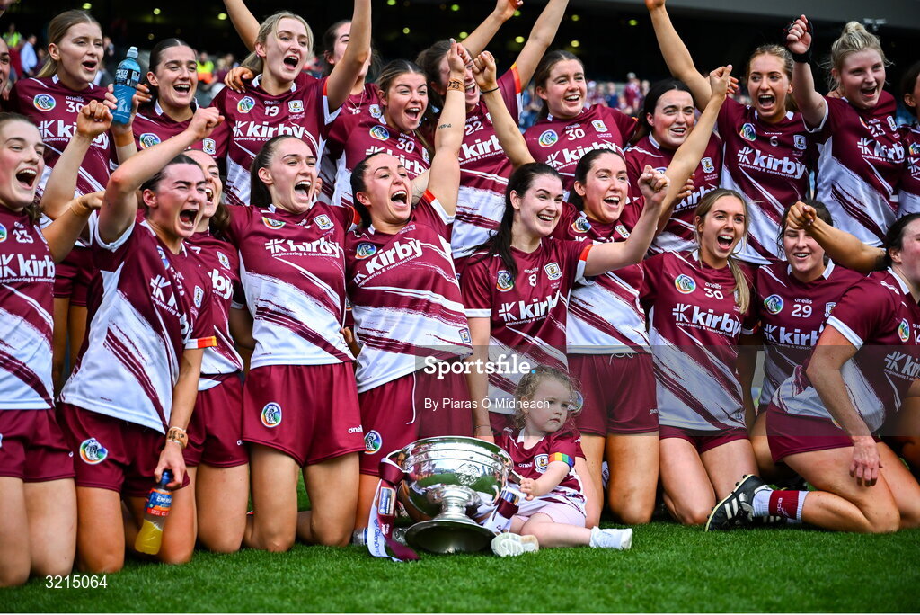 10 August 2025; Galway players celebrate after the Glen Dimplex All-Ireland Senior Camogie Championship final match between Cork and Galway at Croke Park in Dublin. Photo by Piaras Ó Mídheach/Sportsfile