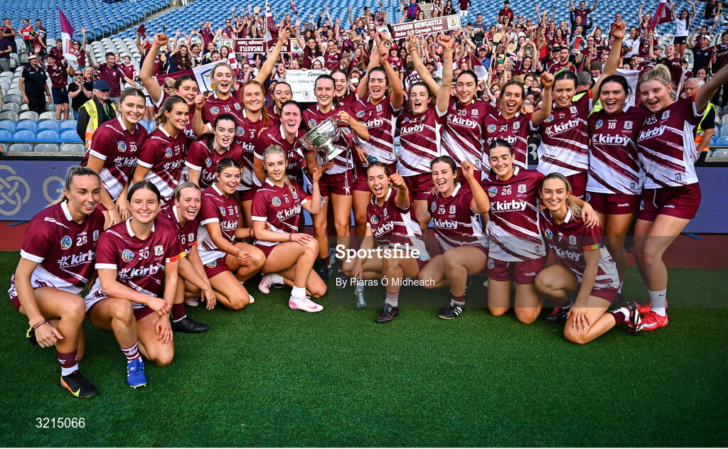 10 August 2025; Galway players celebrate after the Glen Dimplex All-Ireland Senior Camogie Championship final match between Cork and Galway at Croke Park in Dublin. Photo by Piaras Ó Mídheach/Sportsfile